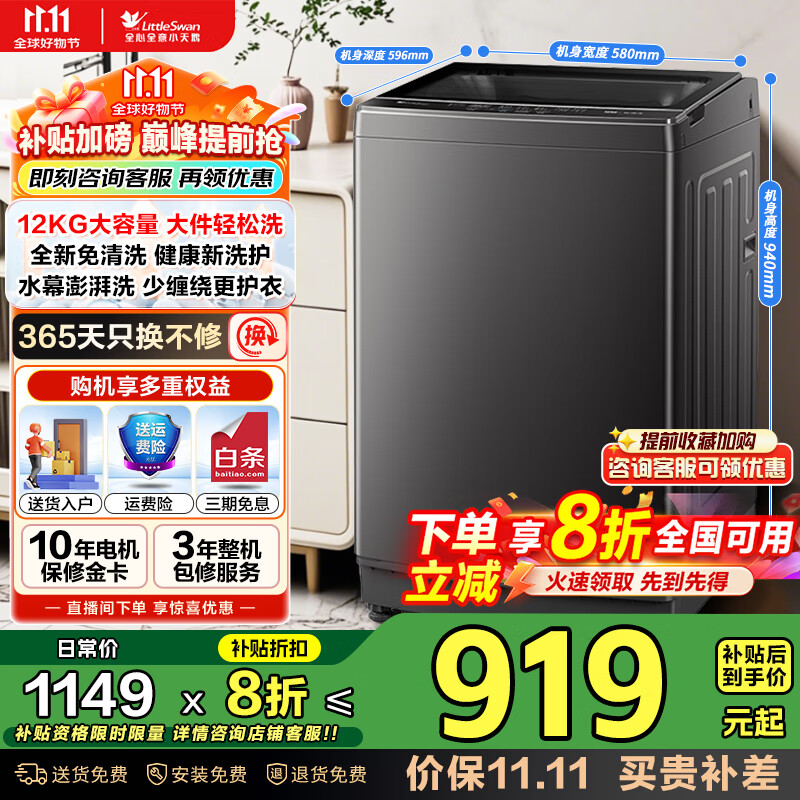 小天鹅(LittleSwan)波轮洗衣机全自动 10公斤大容量 定频/直驱变频 一级能效 全家衣物一桶洗 抗菌除螨 以旧换新补贴 【12公-斤定频】泡泡净漩瀑洗+大件轻松洗