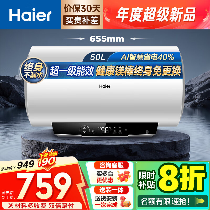 海尔(Haier)【下单立省20%】热水器家用储水式电热水器速热恒温超一级能效省电保温智能镁棒免更换抑菌MC3 50L 2200W 【25年新款】MC3PRO
