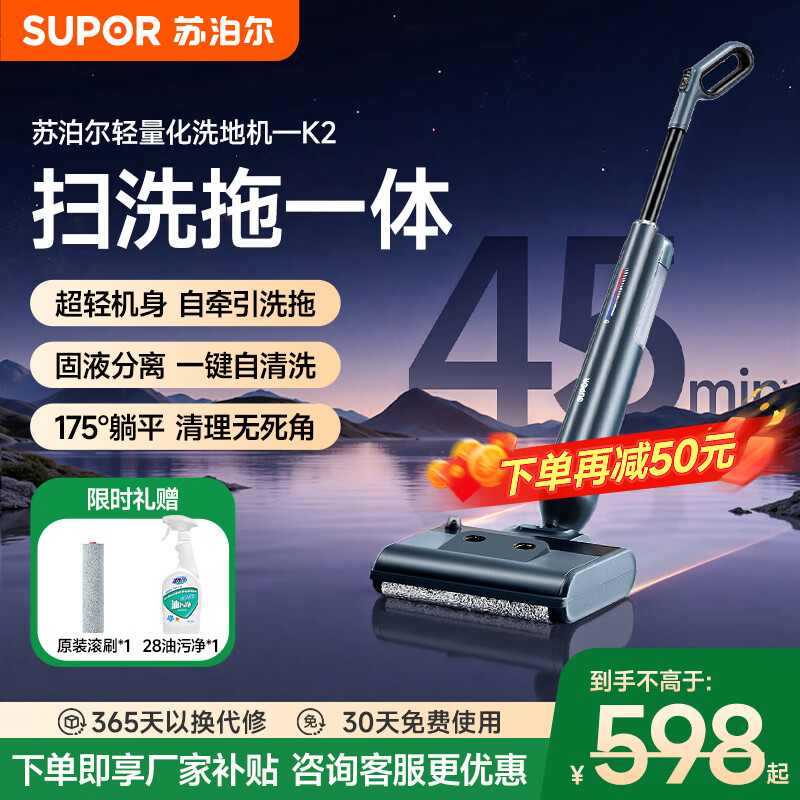 苏泊尔洗地机洗拖一体拖地机家用自动清洗固液分离无异味轻音轻量自牵引电动拖把EMC-K2 升级款-B扫洗拖三合一