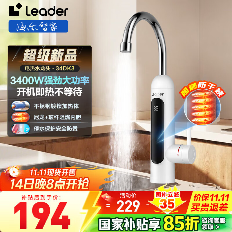 海尔(Haier)即热式电加热水龙头厨房安全速热家用热水宝 防漏电快热电热水器 下进水小厨宝加热器 统帅Leader水龙头LDST-34DK3(C)
