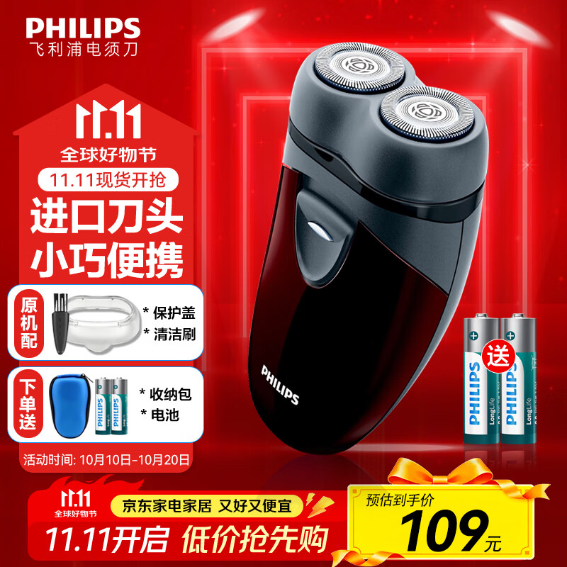飞利浦(PHILIPS)【价保11.11提前抢】剃须刀电动男士刮胡刀电动刀 进口双刀头剃胡刀干电池便携式须刨电须刀送老公 PQ206/18【经典干电池款】