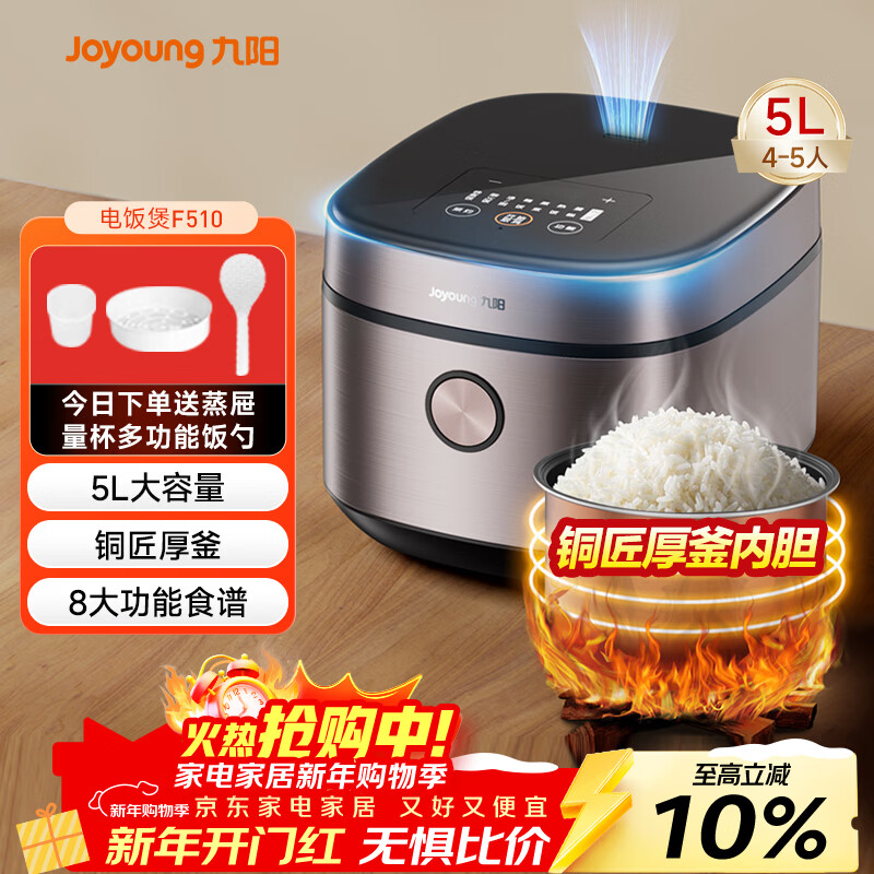 九阳(Joyoung)5升大容量4~5人电饭煲电饭锅八大烹饪菜单大火快煮智能预约微压多功能5L饭煲F510