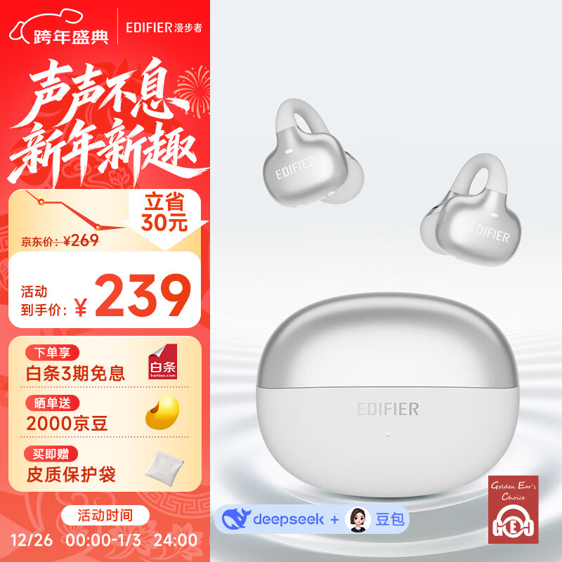 漫步者(EDIFIER)【2025年新款】X Clip耳夹式蓝牙耳机 AI翻译 开放式 跑步运动耳机 蓝牙6.0 月岩白 新年礼物