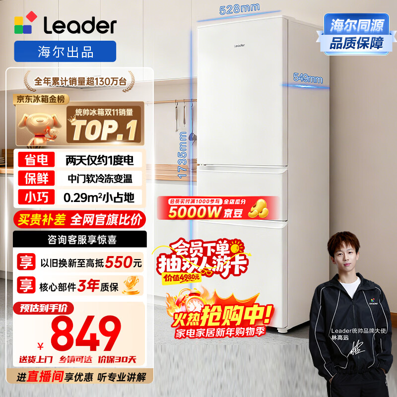 统帅(Leader)海尔冰箱出品悦享系列218L三门家用小冰箱二级能效直冷软冷冻冰箱LC3-226L9以旧换新补贴