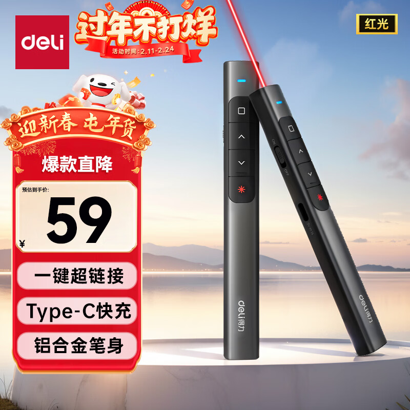 得力(deli)红光激光笔 翻页笔教师用演讲笔 PPT翻页笔 投影笔激光翻页笔极速快充 无线演示 黑色MA120