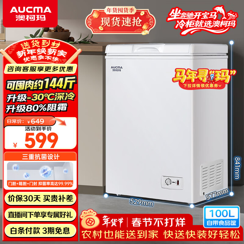 澳柯玛(AUCMA)100升单温冷柜家用减霜小冰柜冷藏柜冷冻柜小型冷柜卧式顶开门冰箱一级能效 BC/BD-100H 以旧换新