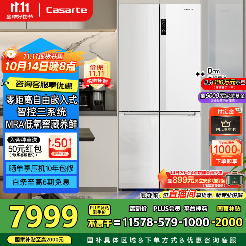 卡萨帝(Casarte)【星悦】551升原石零嵌入大容量四开门超薄三系统家用国家补贴一级能效冰箱BCD-551WLCTDM4WKU1
