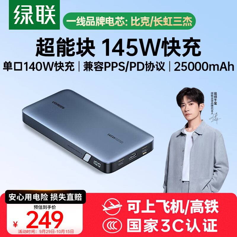 绿联【3C认证可上飞机】超能块145W笔记本充电宝25000毫安PD140W快充 大容量功率移动电源适用苹果电脑