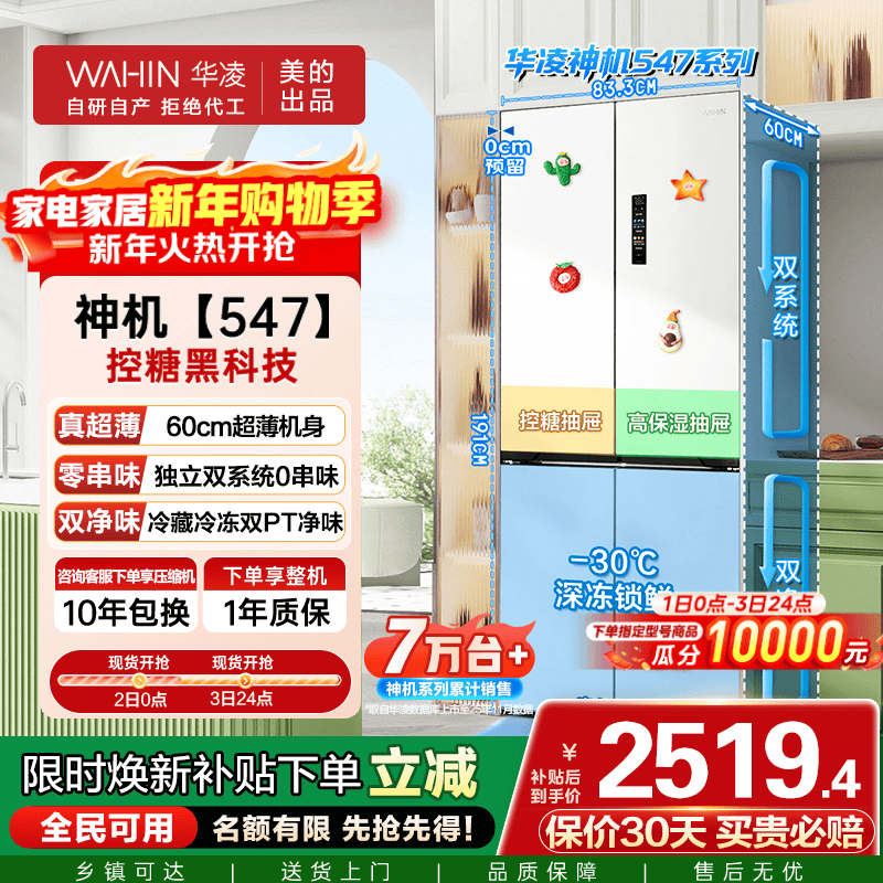 华凌 神机547美的出品双系统双循环60cm超薄零嵌入十字对冰箱国家补贴20%一级能效HR-547WUSPZ白月光