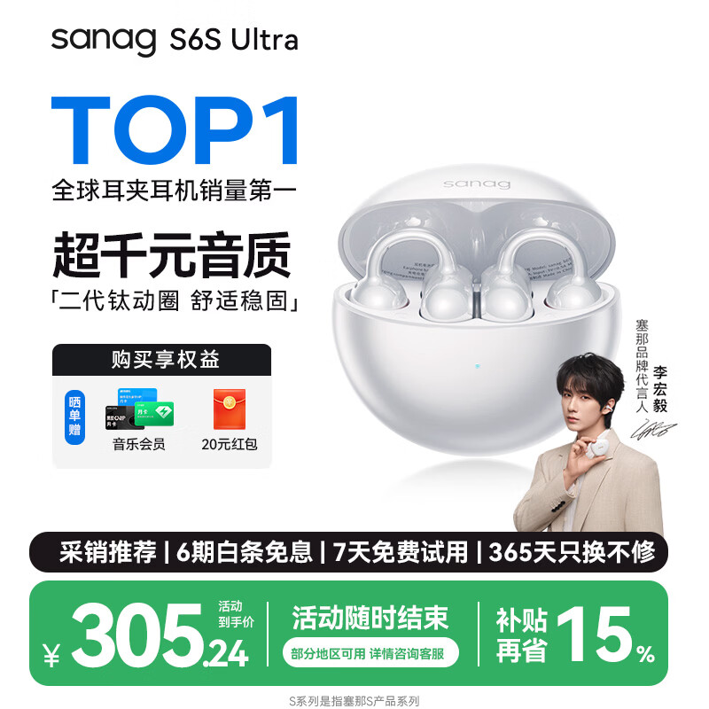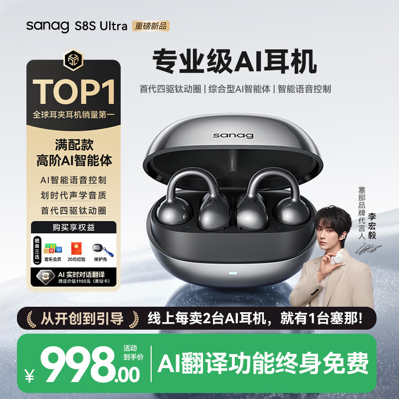 SANAG塞那【焕新补贴15%】S6S Ultra蓝牙耳机耳夹式气骨传导概念开放式不入耳运动挂耳式无线AI翻译耳机