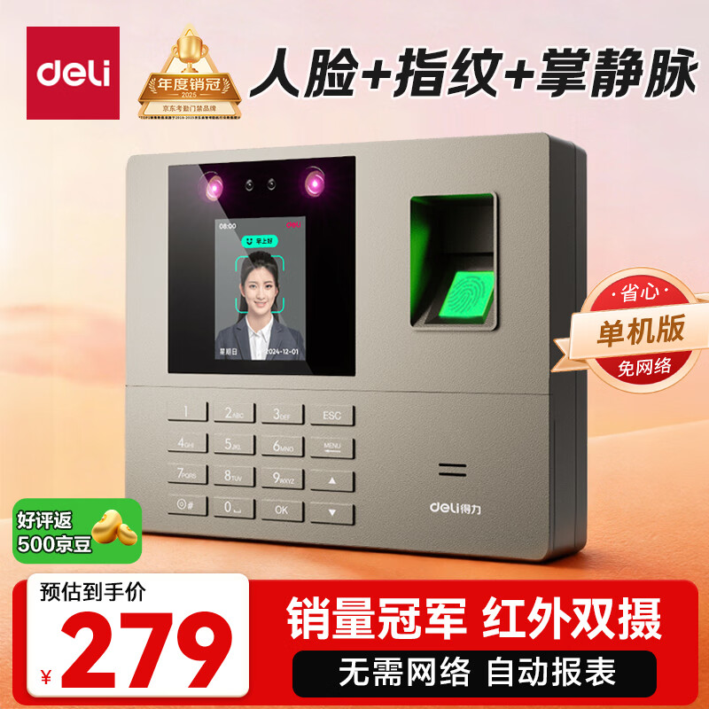 得力考勤机 打卡机人脸指纹掌静脉一体机 免软件免网络 三步设置 自动生成报表 U盘导报表 销冠王33800