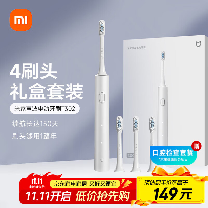 米家小米电动牙刷T302成人/学生 4种净齿模式 150天续航 4支刷头 银灰色