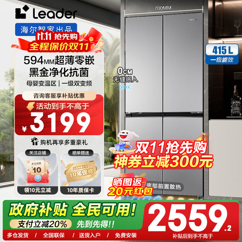 海尔冰箱出品统帅415升冰箱超薄零嵌入式70cm宽十字对开四开门一级能效双变频家用风冷无霜 家电补贴 594mm超薄零嵌+一级双变频+黑金净化+三档变温