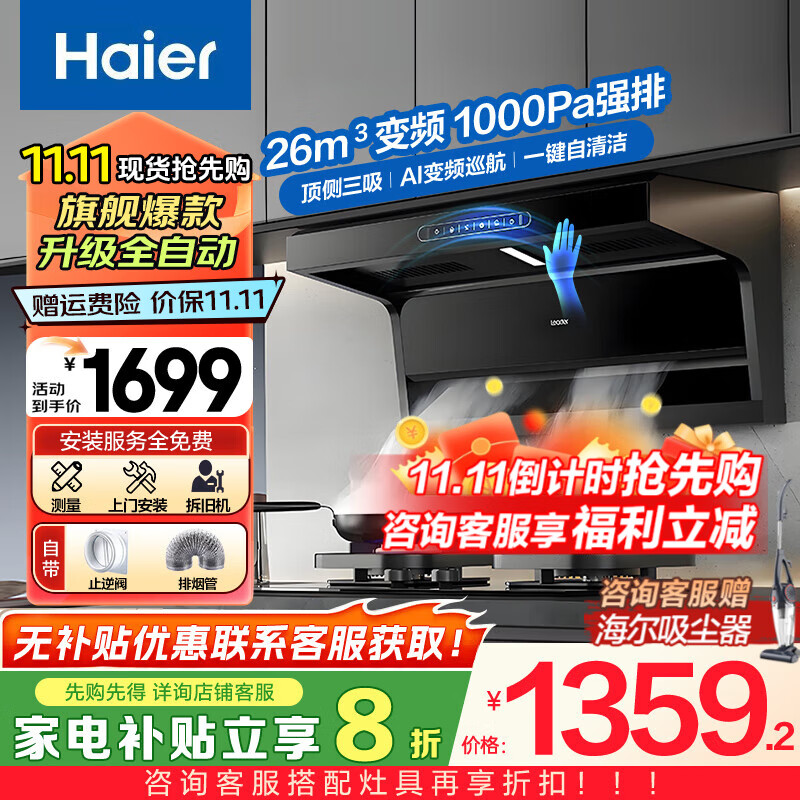海尔(Haier)变频抽油烟机大吸力家用吸油烟机燃气灶具套装26立方顶侧双吸静音三件套二件套Leader 25立方 【爆款油烟机】26m³变频1000帕-顶侧三吸
