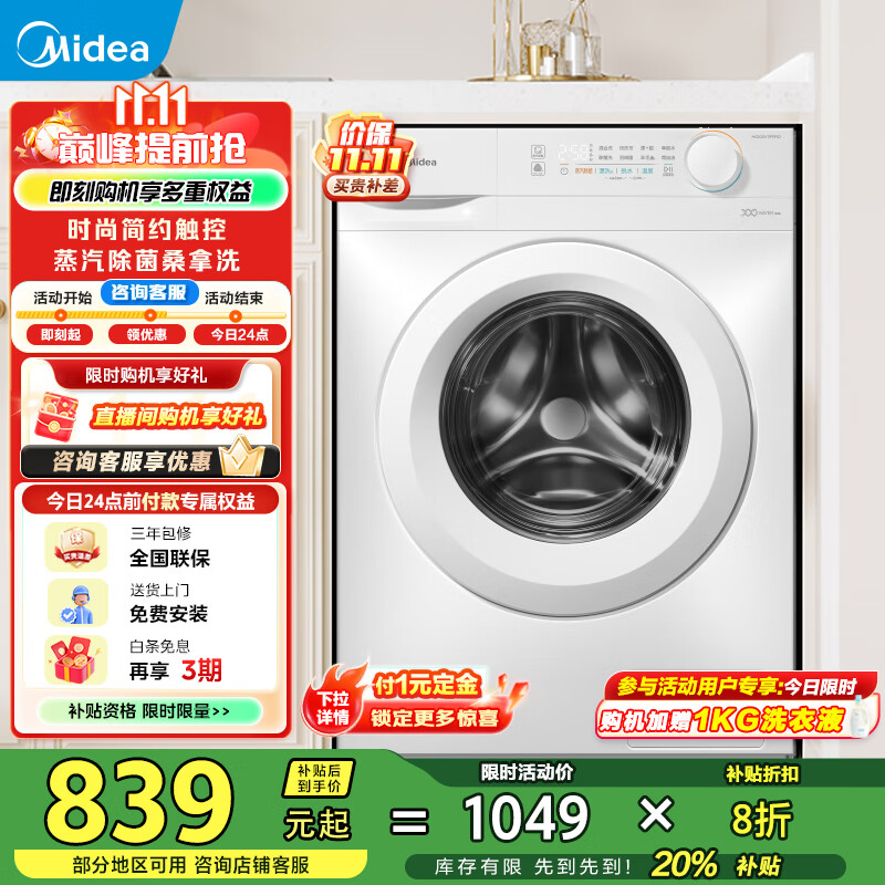 美的(Midea)滚筒洗衣机全自动10公斤大容量巴氏除菌洗高温筒自洁蒸汽除菌 一级能效 以旧换新 家电国家补贴20% MG100V11FPRO