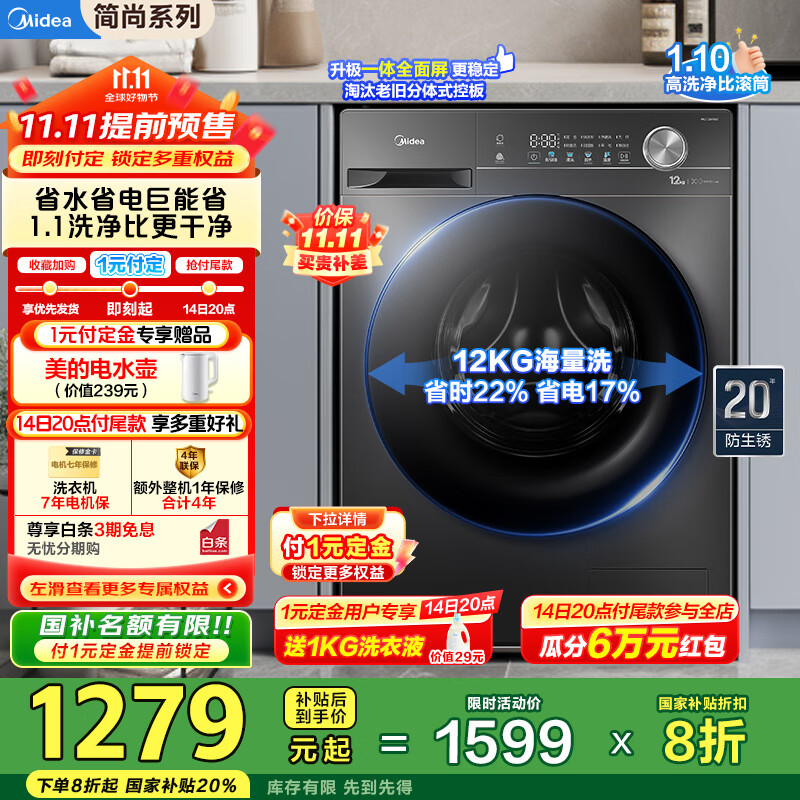 美的(Midea)12公斤滚筒洗衣机全自动家用大容量 1.1超高洗净比 除菌净螨 一级能效 简尚系列 家电国家补贴20% MG120V36T