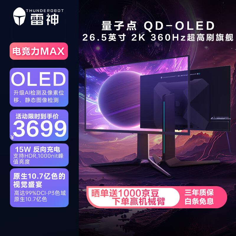 雷神26.5英寸 2K OLED 360Hz 硬件低蓝光 0.03ms HDR1000nit 15W反向充旋转升降电竞显示器DQ27F360E