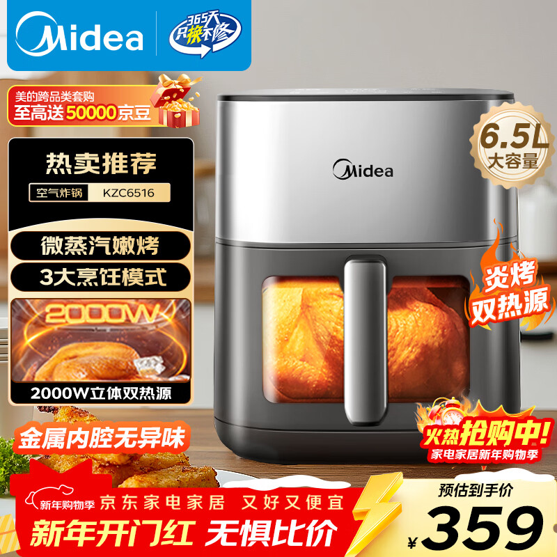 美的(Midea)炎烤免翻面家用空气炸锅蒸烤一体可视窗口上下双热源6.5L大容量金属内腔微蒸汽嫩烤 MF-KZC6516