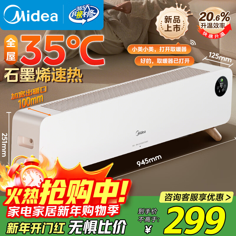 美的(Midea)【随变暖】石墨烯家用踢脚线取暖器/语音智能浴室暖风机/节能电热电暖器/可立可卧电暖气NDS-BZT