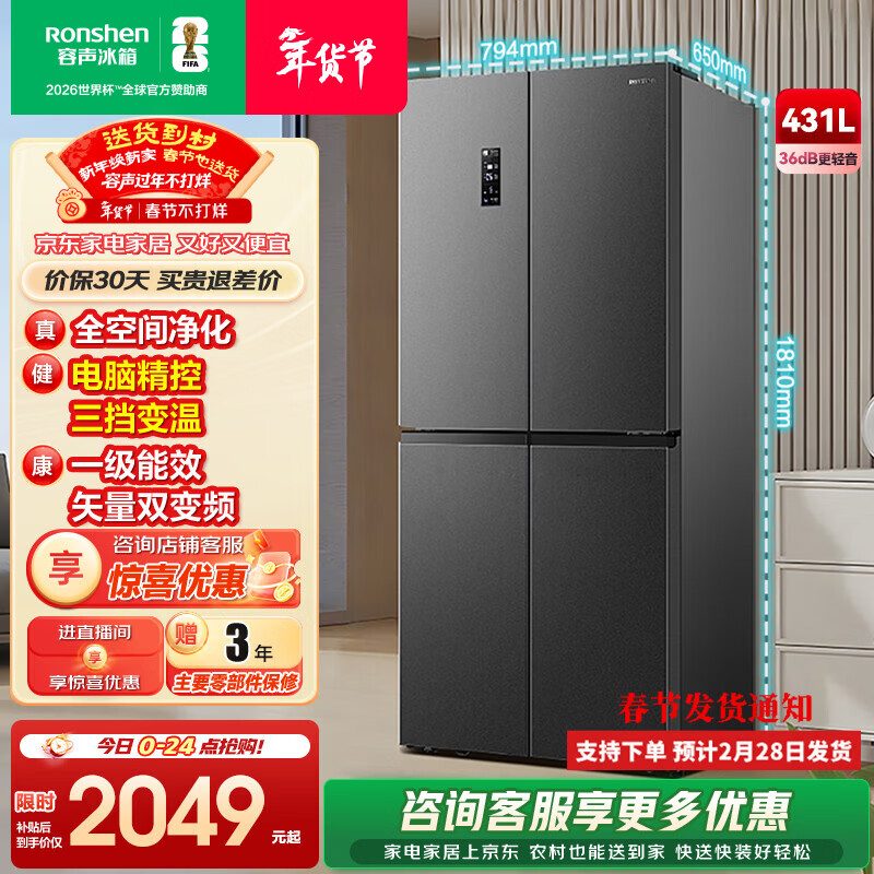 容声431升十字对开门冰箱全空间净化升级四开门一级能效变频大容量风冷无霜 以旧换新 BCD-431WD12FP灰