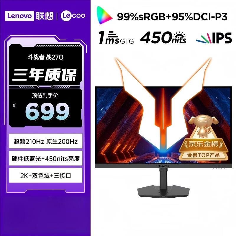 联想来酷斗战者27英寸2K QHD原生200Hz超频210Hz高刷1msGTG 旋转升降 暗区突围电竞游戏显示器 战27Q