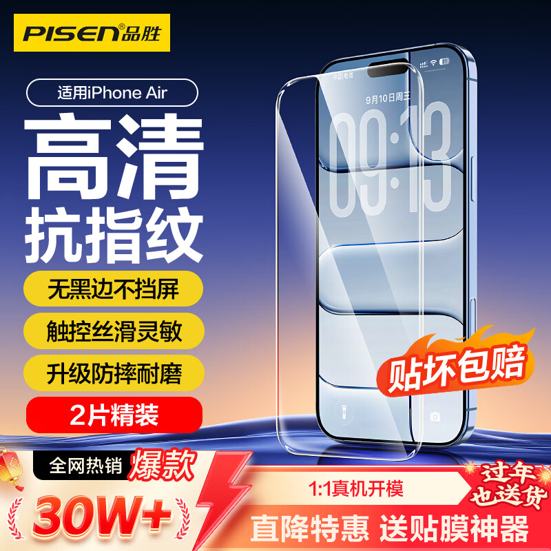 品胜【升级强化款】适用iPhone Air钢化膜苹果17Air手机膜无黑边全屏高清抗指纹防摔耐磨保护膜 2片装