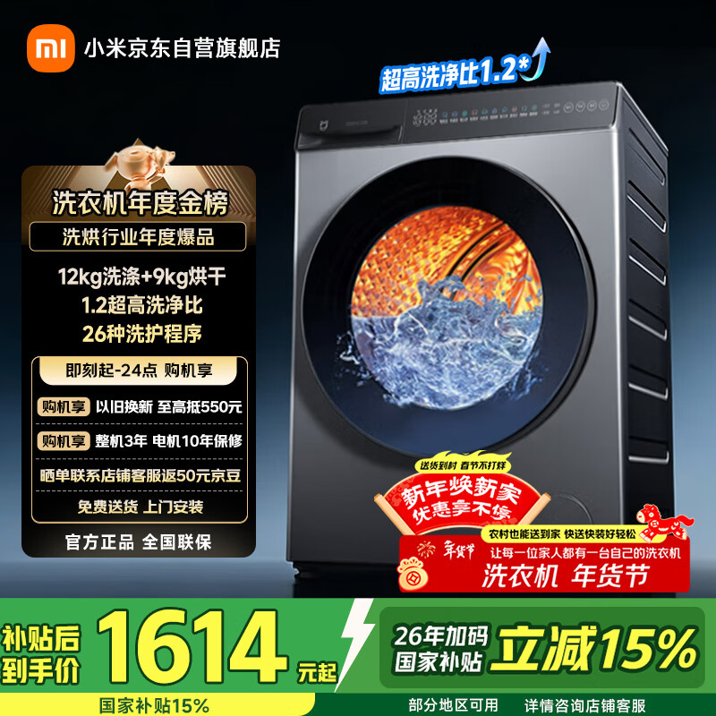 米家小米洗衣机全自动家用滚筒带烘干洗烘一体12公斤超大容量1.2洗净比一级能效国家补贴XHQG120MJ101