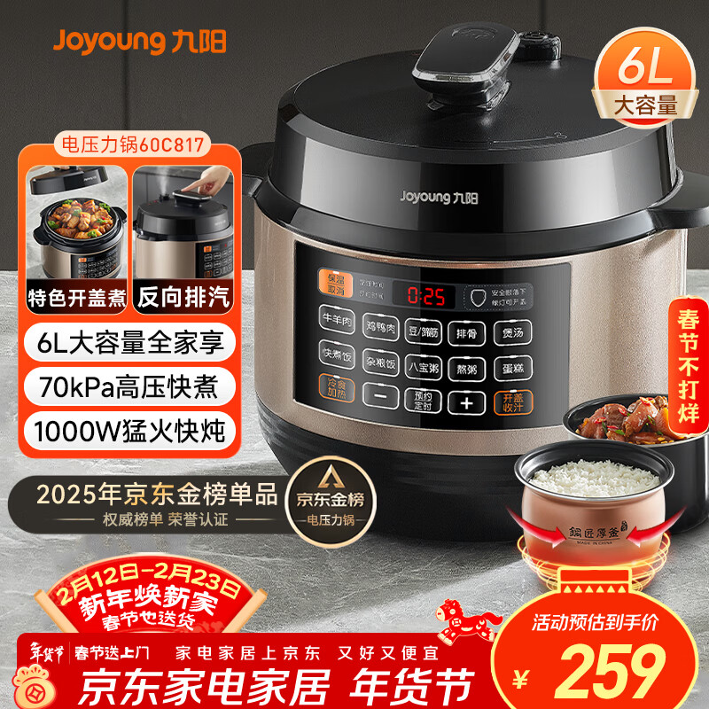 九阳(Joyoung)6L大容量电压力锅家用双胆全自动智能预约煲汤炖肉煮粥多功能Y-60C817电饭煲高压锅6-8人