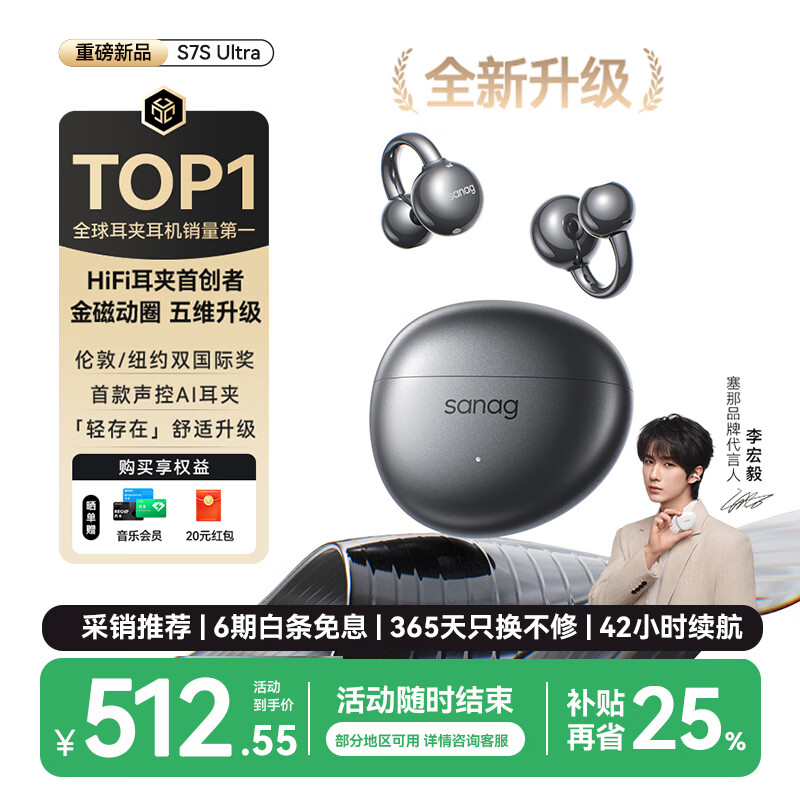 SANAG塞那S7SUltra蓝牙耳机耳夹式运动无线 气骨传导概念挂耳超长续航新款金榜AI翻译机