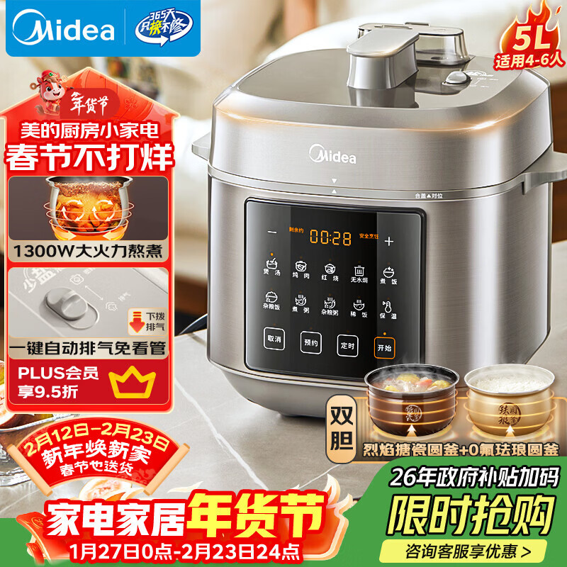 美的(Midea)【自营年货】电压力锅0氟球胆5L电饭煲大容量4-6人 触控双胆高压锅全自动智能预约开盖煮MY-E5923