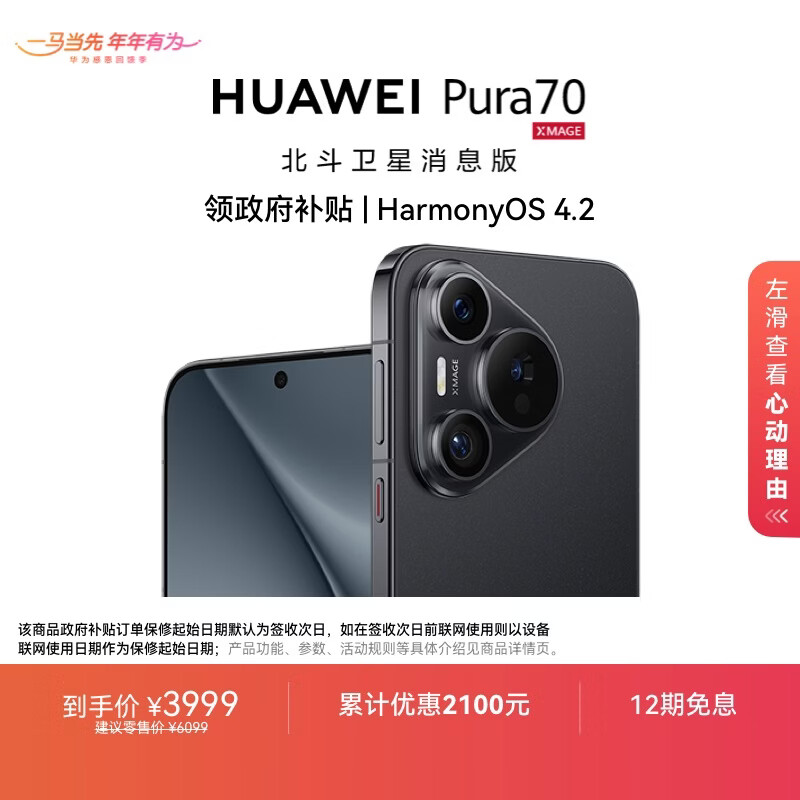 HUAWEI Pura 70 12GB+512GB 羽砂黑 北斗卫星消息版 第二代昆仑玻璃【鸿蒙系统4.2 适配主流APP】