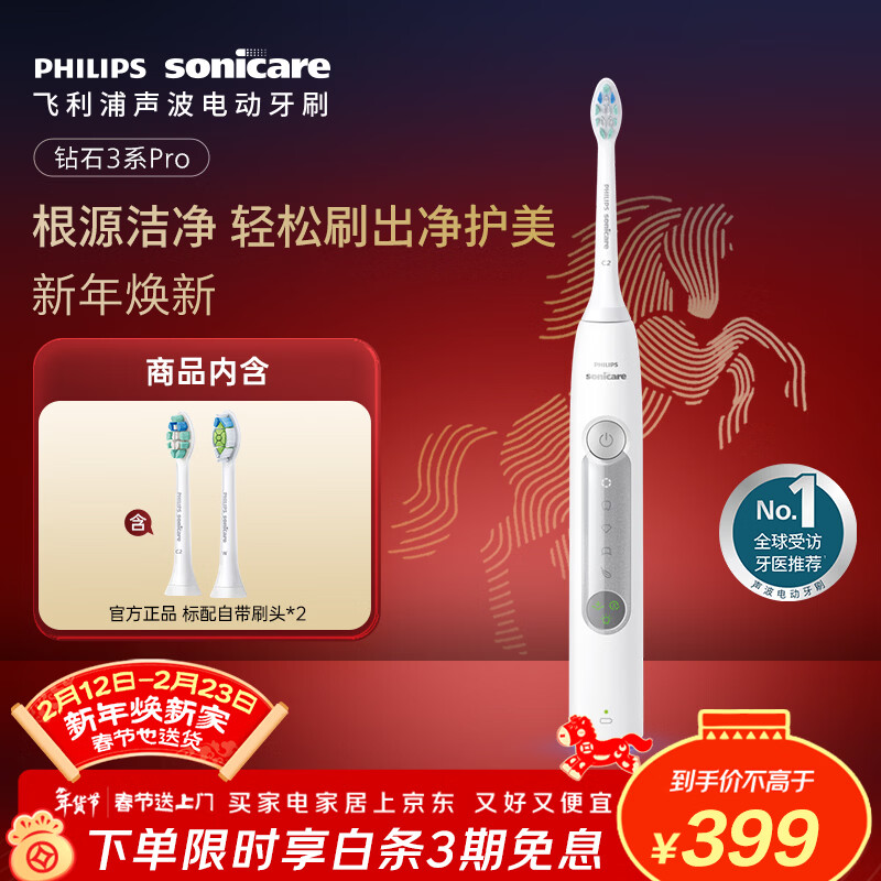 飞利浦(PHILIPS)【肖战推荐】声波电动牙刷钻石3系Pro生日礼物 春节不打烊 情侣款送男生/女友深层清洁HX5272/