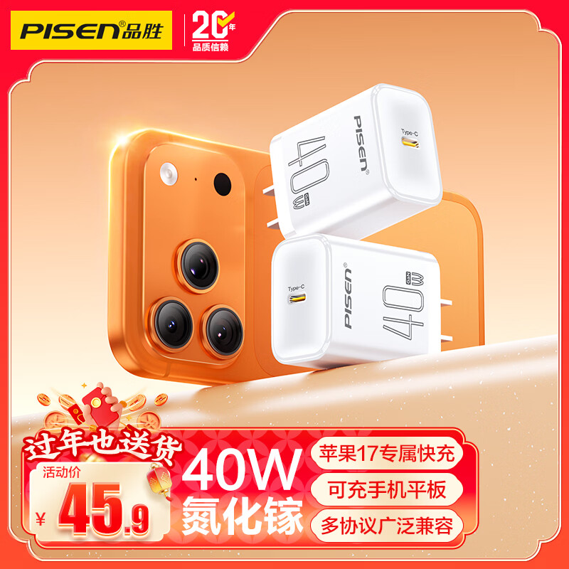 品胜3C认证PD40W氮化镓苹果17promax充电器插头Type-C快充适用iPhone16/15华为p80小米安卓手机平板30W