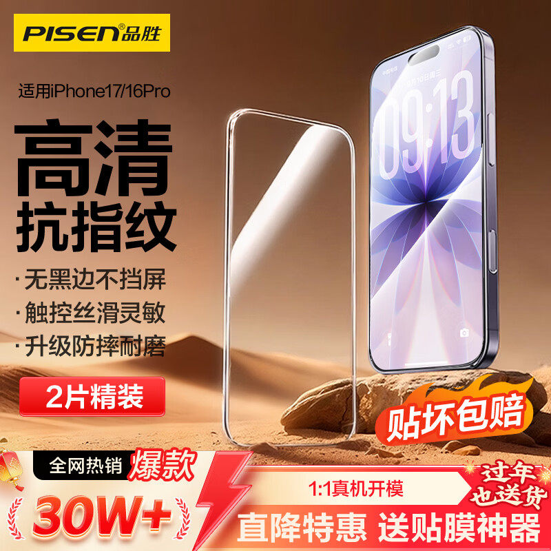 品胜【热销30万+|无黑边不挡屏】适用苹果17/16Pro钢化膜iPhone17/16Pro手机膜高清防摔抗指纹前膜2片