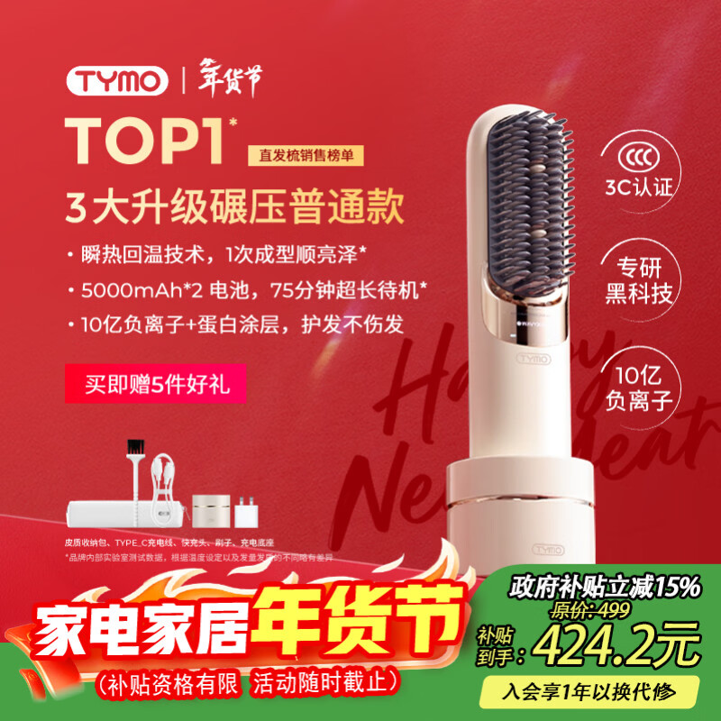 TYMO第5代无线直发梳直板夹10亿负离子不伤发恒温续航更持久一梳即顺高颅顶改善毛躁 情人节礼物送女生