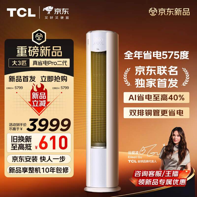 TCL空调新品京东联名真省电Pro二代大3匹新一级能效变频双排铜管立式客厅KFR-72LW/RT2Eb+B1国家补贴