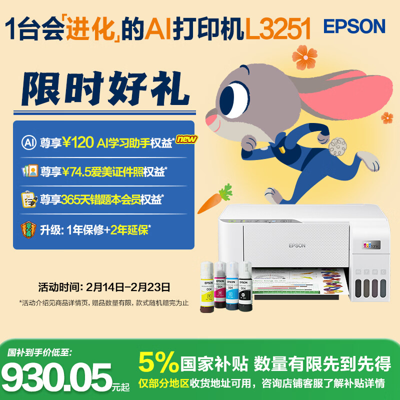 爱普生(EPSON)墨仓式 L3251彩色打印机 微信打印/无线连接 家用打印优选 AI学习打印机(打印、复印、扫描)