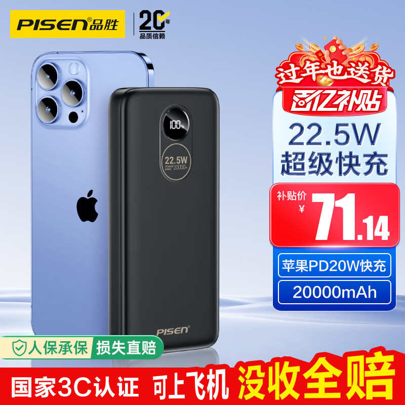 品胜【3C认证可上飞机】22.5W超级快充20000mAh大容量充电宝便携移动电源适用苹果17promax小米华为黑