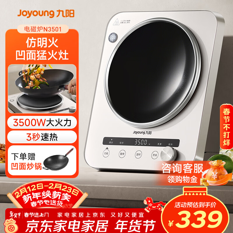 九阳(Joyoung)电磁炉凹面电磁炉电磁灶电陶炉家用3500W大功率猛火多功能电池炉深凹弧面凹灶N3501【赠专用铁锅】