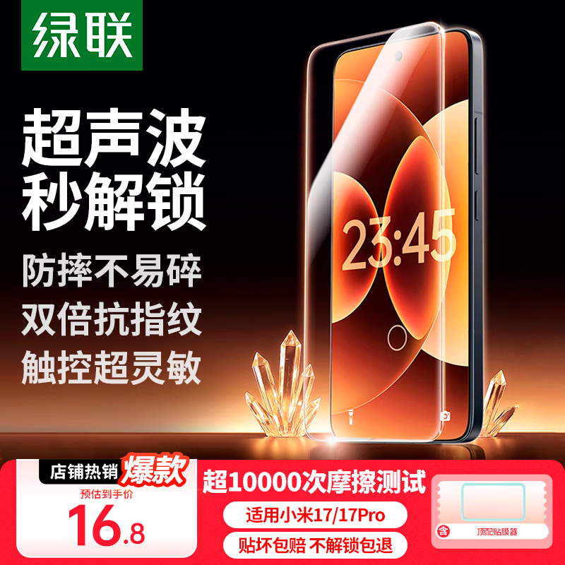 绿联【超声波秒解】适用小米17/17 Pro钢化膜手机膜 全屏无白边超薄手感顺滑防指纹高清膜