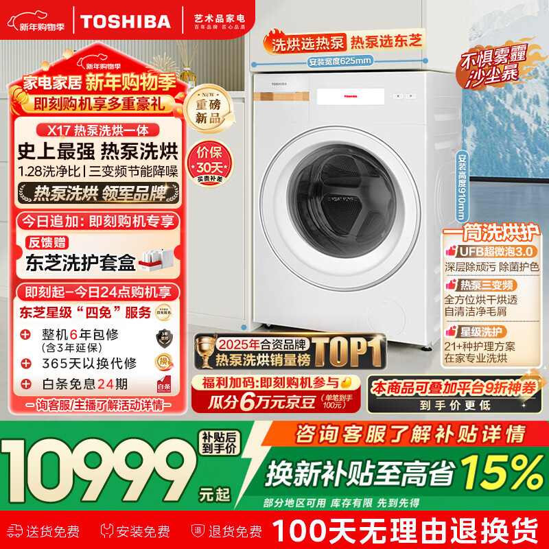 东芝(TOSHIBA)X17热泵洗烘一体滚筒洗衣机全自动 纯平全嵌 12公斤大容量三变频 静音省电高洗净比 DGH-127X17BW