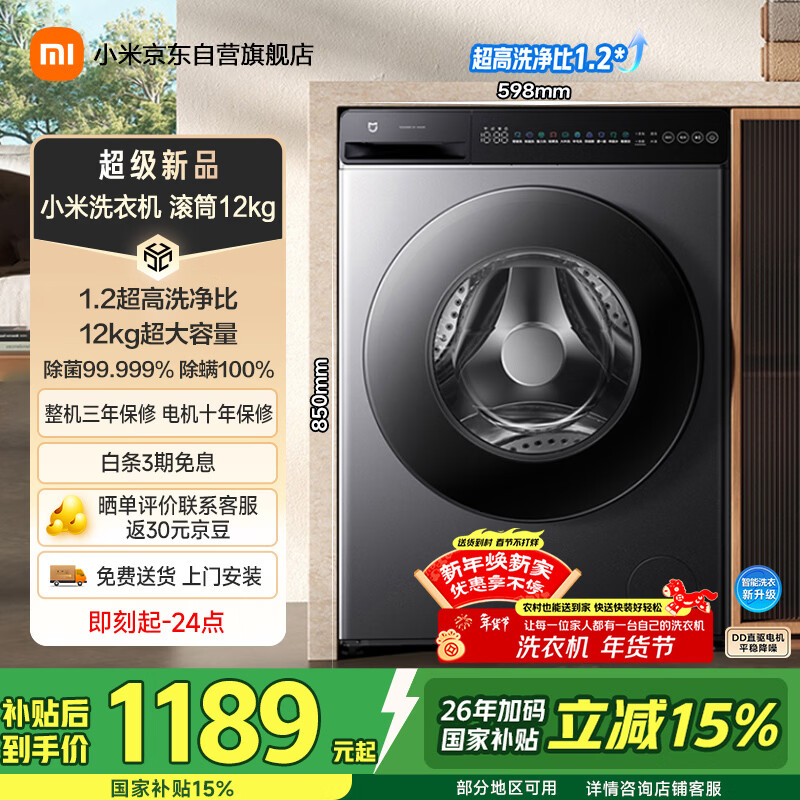 米家小米滚筒洗衣机全自动12公斤大容量超薄嵌入高洗净比一级能效国家补贴 XQG120MJ103