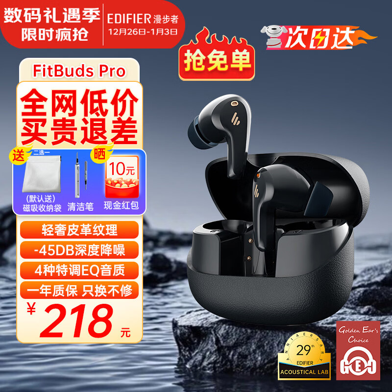 漫步者(EDIFIER)FitBuds Pro真无线主动降噪蓝牙耳机太空舱入耳式低延迟轻奢学生音乐游戏运动礼物适配于苹果华为 【皮革纹理设计】秘境蓝+收纳袋