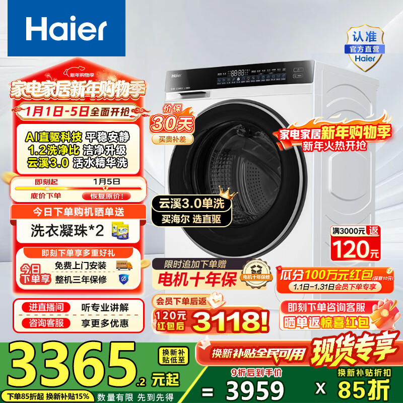 海尔(Haier)云溪3.0滚筒洗衣机全自动10公斤单洗 懒人家用AI直驱变频升级智投大容量582WU1白 家电换新补贴15% 【云溪3.0白】高端单洗丨以旧换新丨全新升级