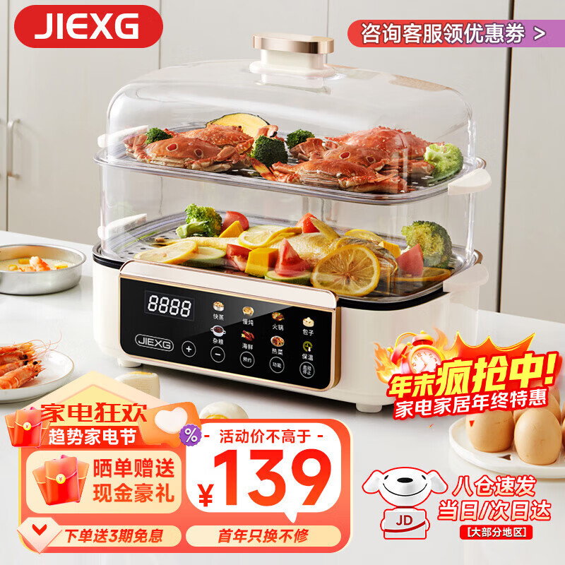 JIEXG电蒸锅蒸煮一体多功能锅家用电火锅蒸汽锅不锈钢炖锅炖蒸蟹器大容量多层蒸箱 【34升】智能款-【预约+可视+蒸煮一体】