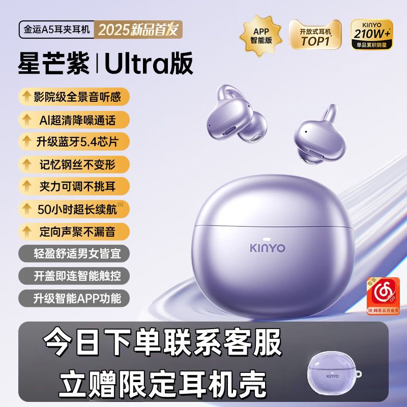 金运【全网舒适第一名】A5蓝牙耳机耳夹式骨传导概念开放式不入耳无线运动跑步通话降噪续航翻译 【暮光紫】影院全景音丨超舒适不漏音