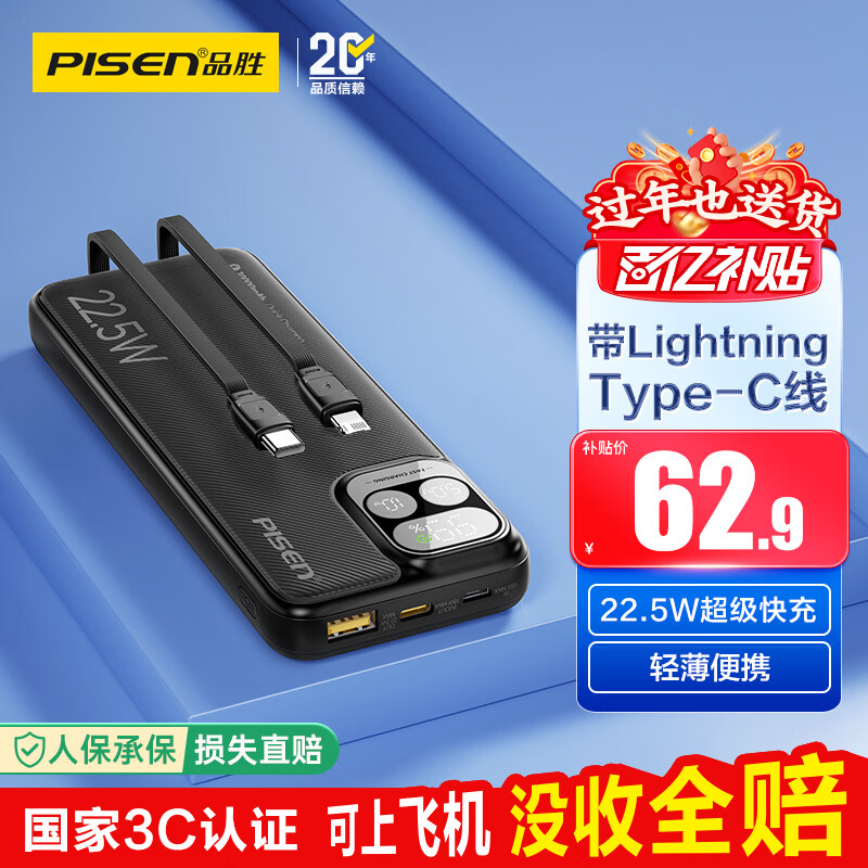 品胜【3C认证可上飞机】充电宝自带线10000毫安大容量22.5W快充移动电源适用苹果17promax小米华为黑