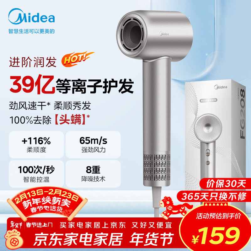 美的(Midea)高速吹风机 39亿等离子护发 大功率速干家用负离子护发吹风筒 杀菌除头螨电吹风FG208灰 生日礼物