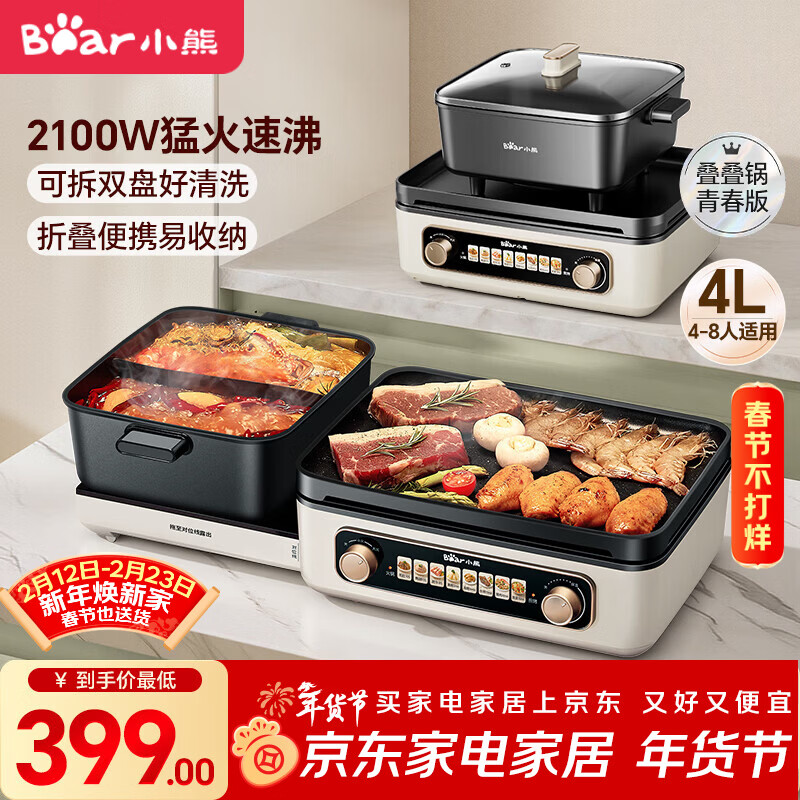 小熊(Bear)电火锅电煮锅火锅专用锅鸳鸯锅 多功能折叠烤涮一体烤鱼锅家用5-8人烤肉锅E22W1叠叠锅青春版