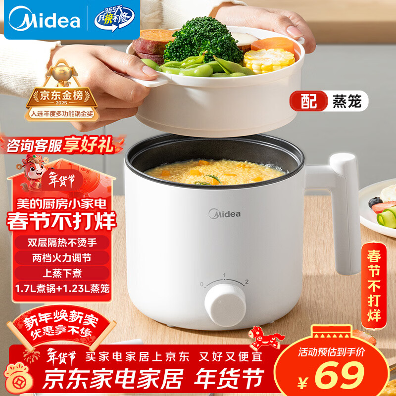 美的(Midea)电煮锅 宿舍小电锅 电蒸锅 学生寝室一体泡面小火锅电煮锅 多功能锅 电热锅 XZE1613 配蒸笼 1.7L